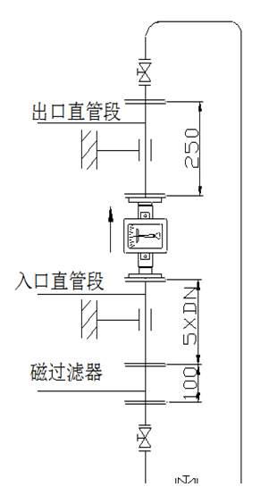 1、流量计的测量管必须垂直安装(±2°),安装时应留有足够的空间,应选择在没有振动(或振动小到可以忽略不计),便于观察和维修的场所,进口前应有五倍公称口径以上长度的直管段,如图所示。